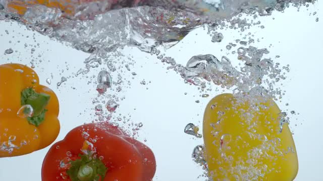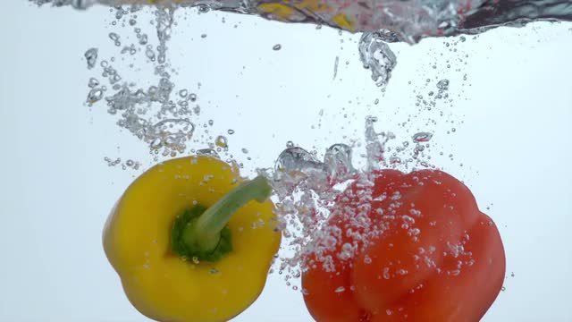 372055 - Bell peppers splashing into water in slow motion; shot on Phantom Flex 4K at 1000 fps