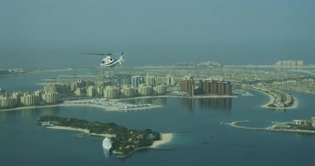 Aerial shot of Dubai focusing on the helicopter flying
