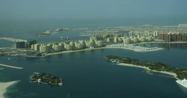 Aerial shot of Dubai that zooms in on the helicopter flying