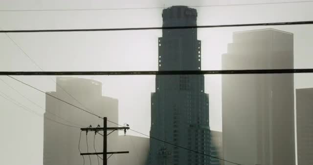 Shot of a building in LA with power lines moving through the frame