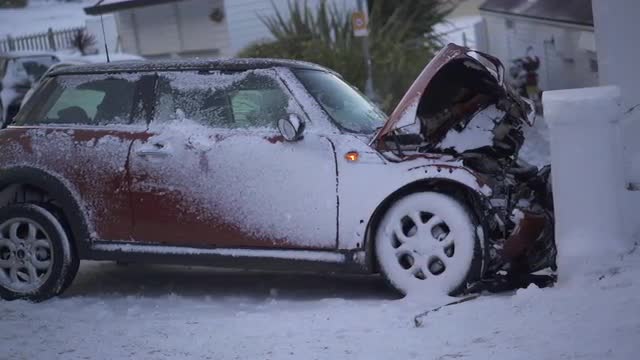 1001110 - Car Crash in the snow at Porthminster Beach, St Ives, Cornwall, England, United Kingdom