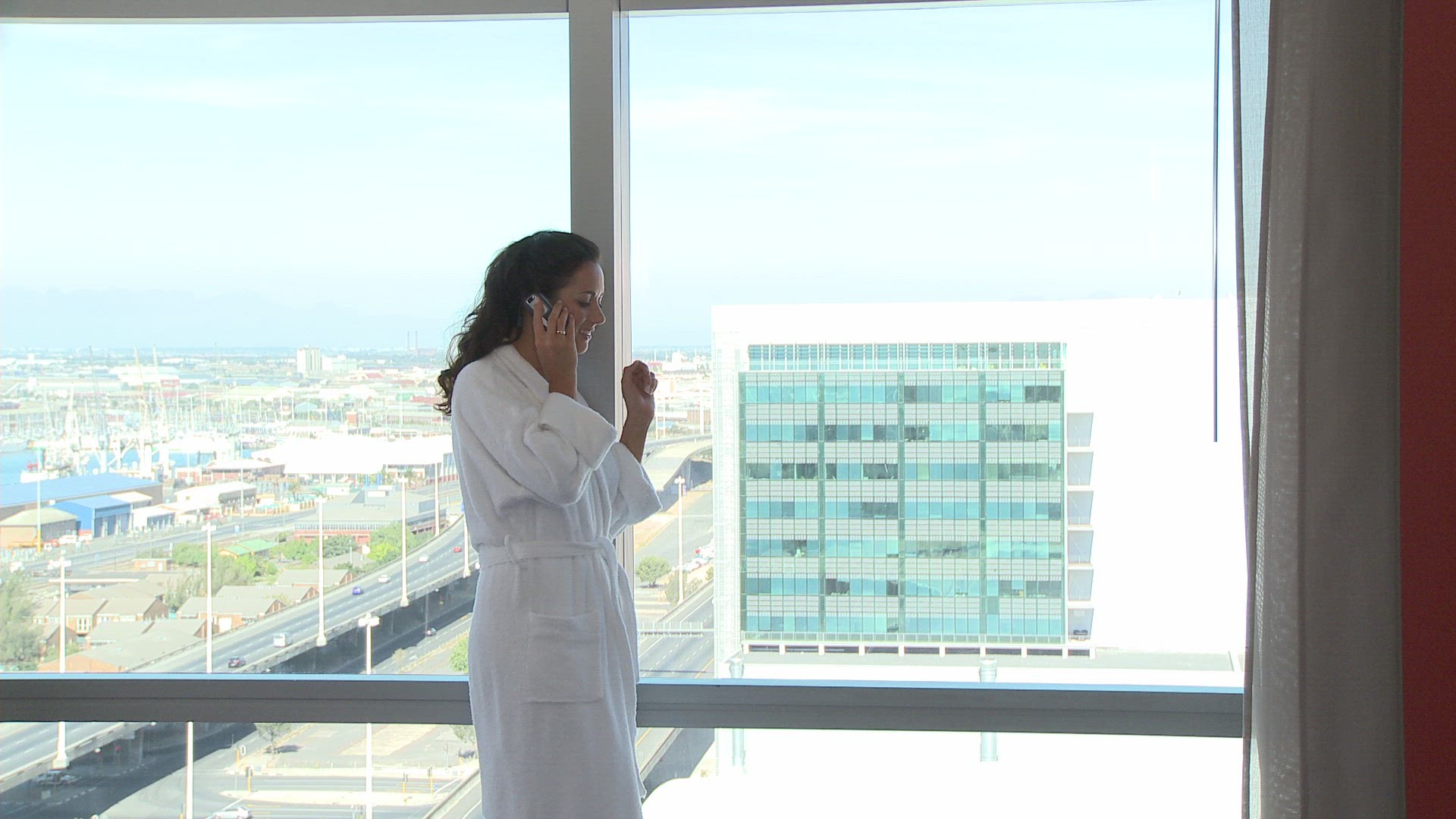 658191 - Young woman open curtains of hotel resort in tropical island, high flor, 4k uhd 2160p