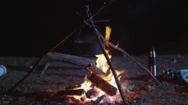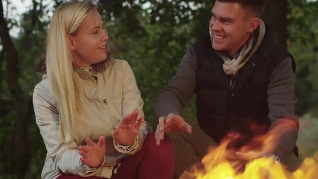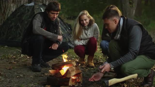 Group of people are sitting in a forest and start a campfire in order to get warm.