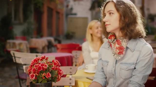 Girl is Sitting in Outdoor Coffee Shop and Drinking Coffee