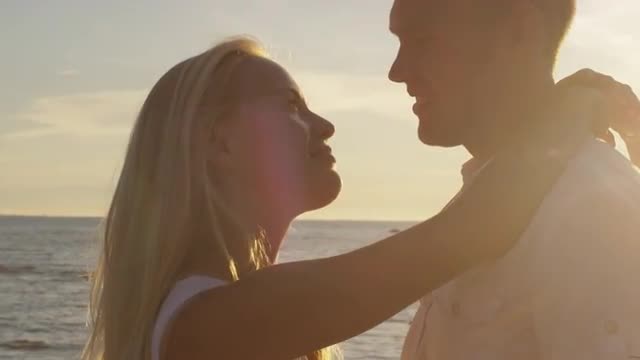 Girl and Man Embracing Each other and Kissing on the Beach in Sunset Light