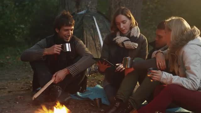 Group of people sit in a forest next to a campfire with warm drinks from thermos and use tablet.