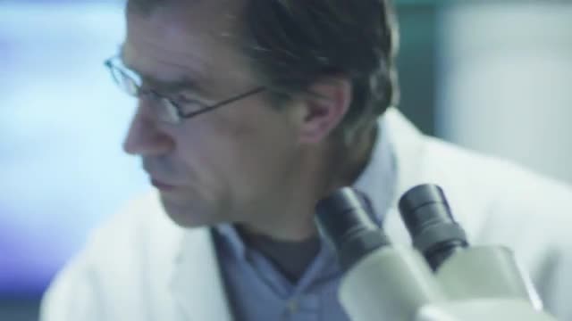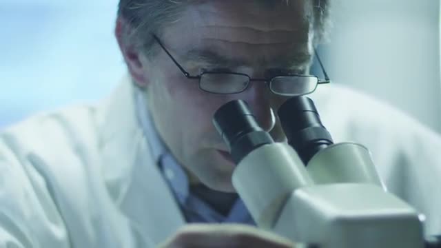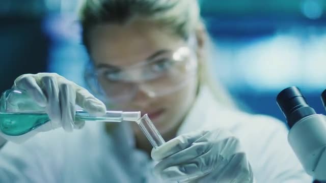 Woman Scientist in Glasses Does Chemical Research and Using Microscope