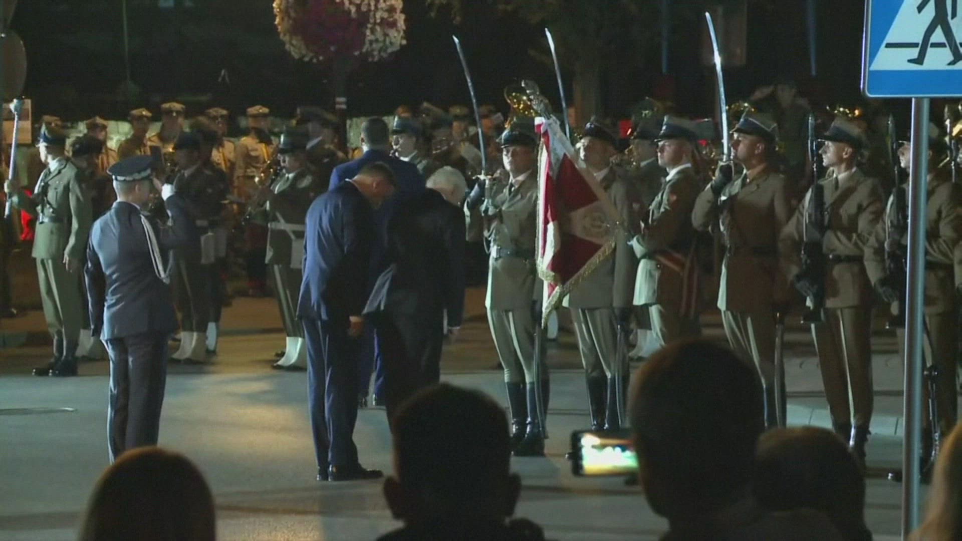 Men and Child on the Brown Horse Celebration of European Victory`s Day in Poland: