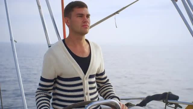 Young man in shorts walks on yacht in the sea.