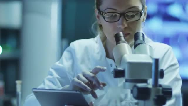 Woman Scientist Using Microscope and Tablet in Laboratory