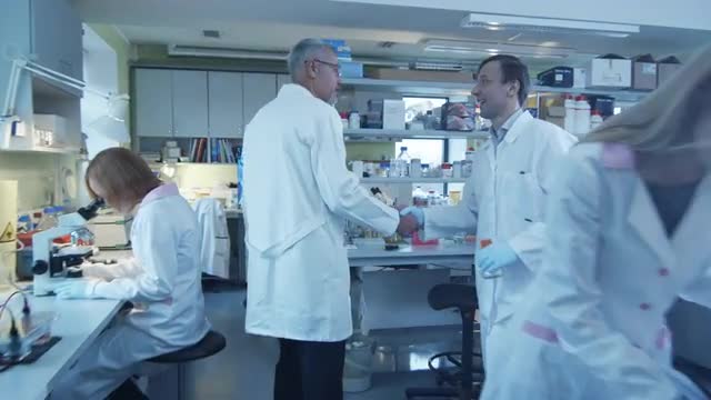 > Senior scientist in white coat is greeting colleagues in a laboratory