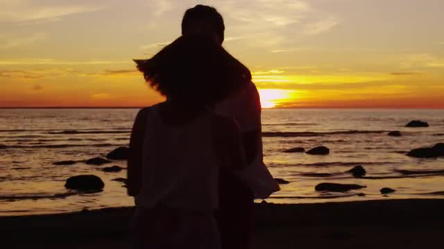 Couple is Dancing on the Beach in Sunset Time.