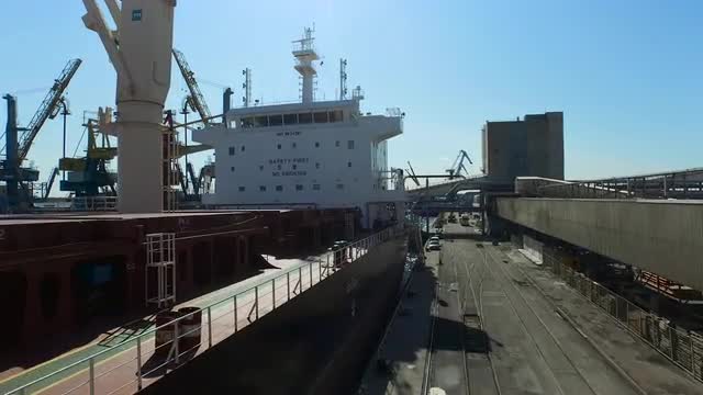 > Aerial Shot of Cargo Harbor with Cranes, Silos and Ships.