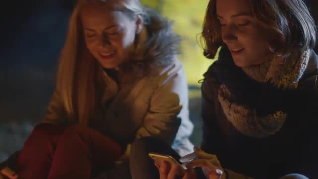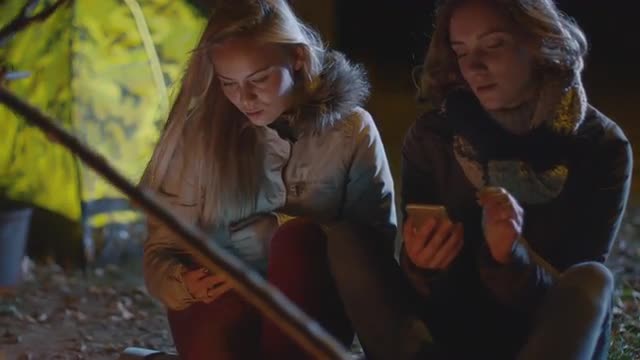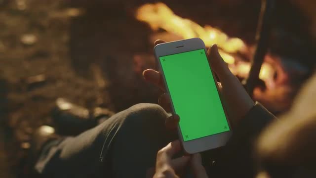 Girl is holding a smartphone in landscape mode with green screen mock-up next to a campfire in the evening.