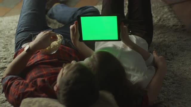 Young Couple are Lying on the floor and Using Tablet PC with Green Screen at Home at Evening Time