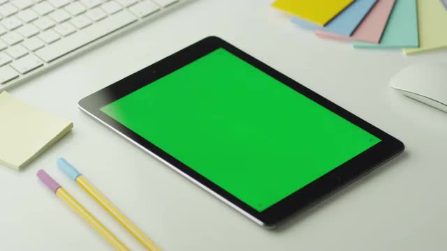 > Designer is Using Tablet with Green Screen in Portrait Mode.