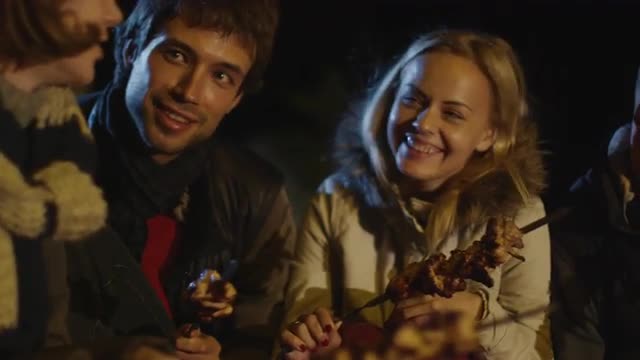 Group of people are trying prepared on campfire meat at night.