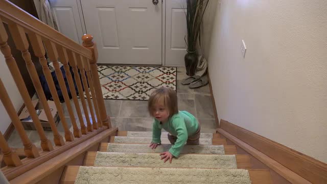 > Toddler crawling down staircase backwards to front door.