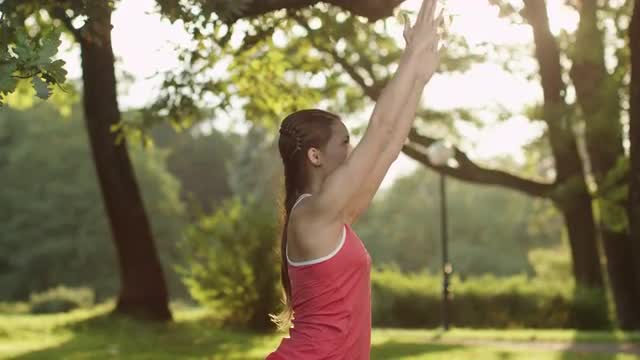 Pretty Girl is doing Yoga in Park. Jib Shot.