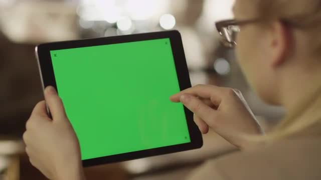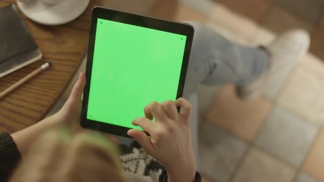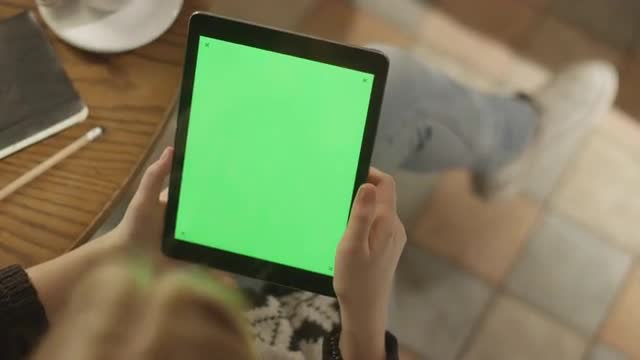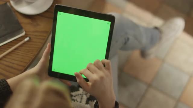 Girl Using Tablet PC with Green Screen in Portrait Mode