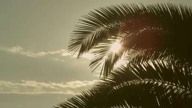 Looking at Sun through Palm Tree Leaves at Sunset Time