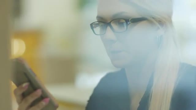 Woman Drinking Coffee and Using Mobile Phone in Cafe