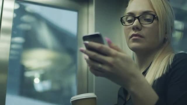 > Woman drinking coffee in elevator