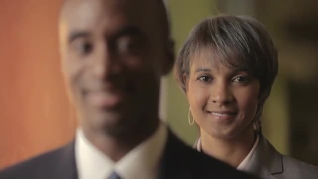 802072 - A businessman shows a businesswoman how to use her smart watch