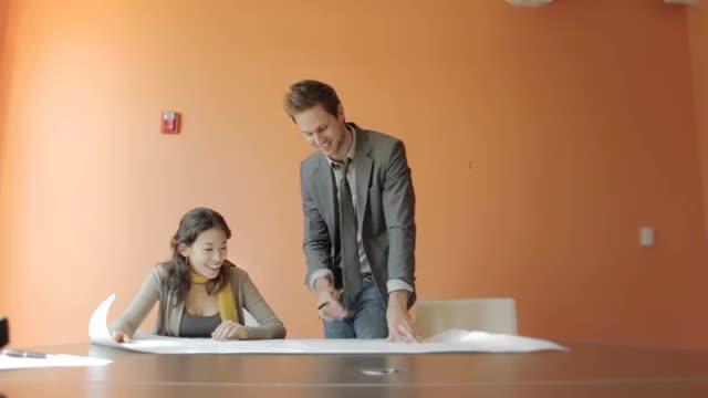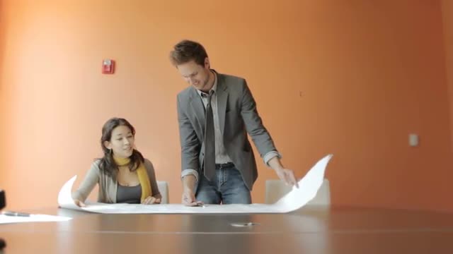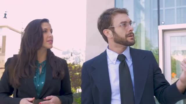 802015 - A businessman walking and talking with his businesswoman colleague outside