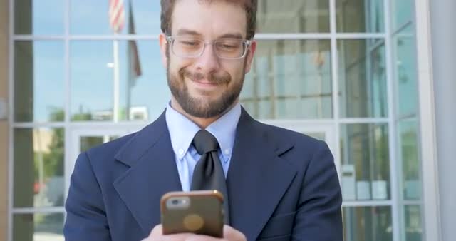 803533 - Happy businessman writing a text email or social media post on smart phone