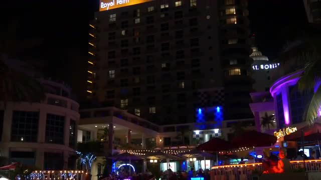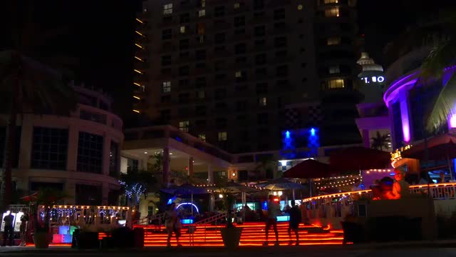 Sun set in Miami's South Beach as seen from hotel. St. Moritz hotel in foreground with fading sunlight in the background. Cars on the street are lightly visible.
