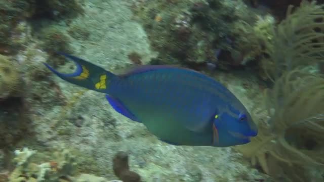 Blue tropical fish swimming around corals