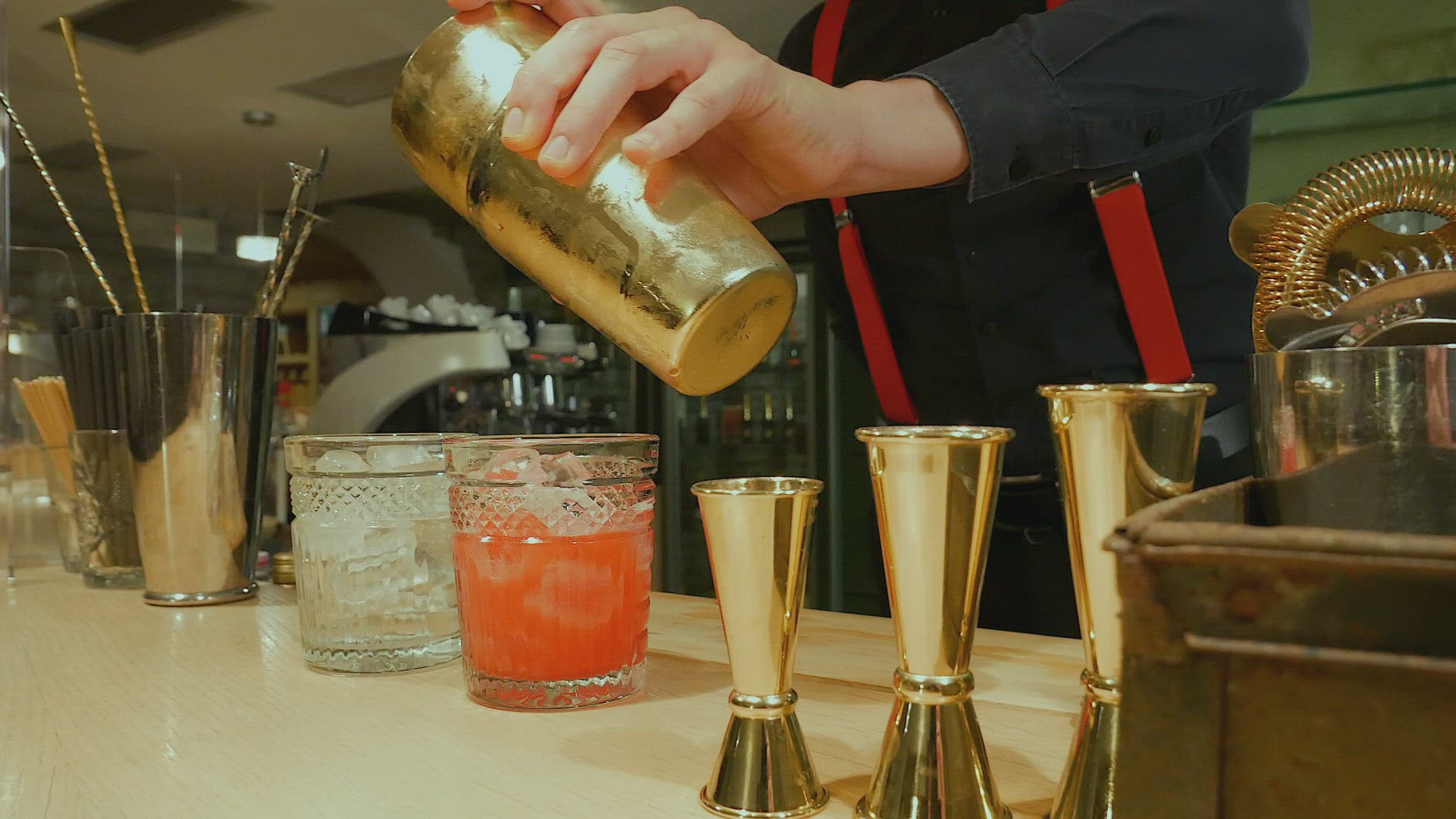 Bartender Preparing a Cocktail. The bartender pours sparkling water from a bottle into a glass.