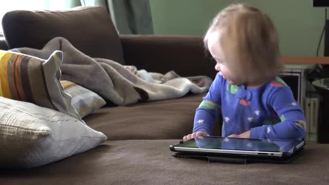 > Toddler gets distracted from tablet computer in blue pajamas. DENVER, COLORADO
