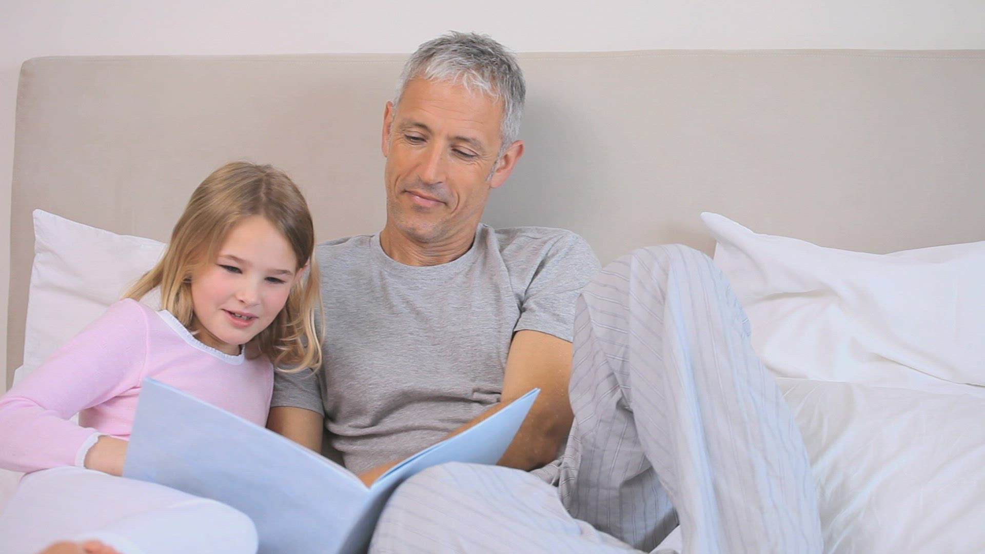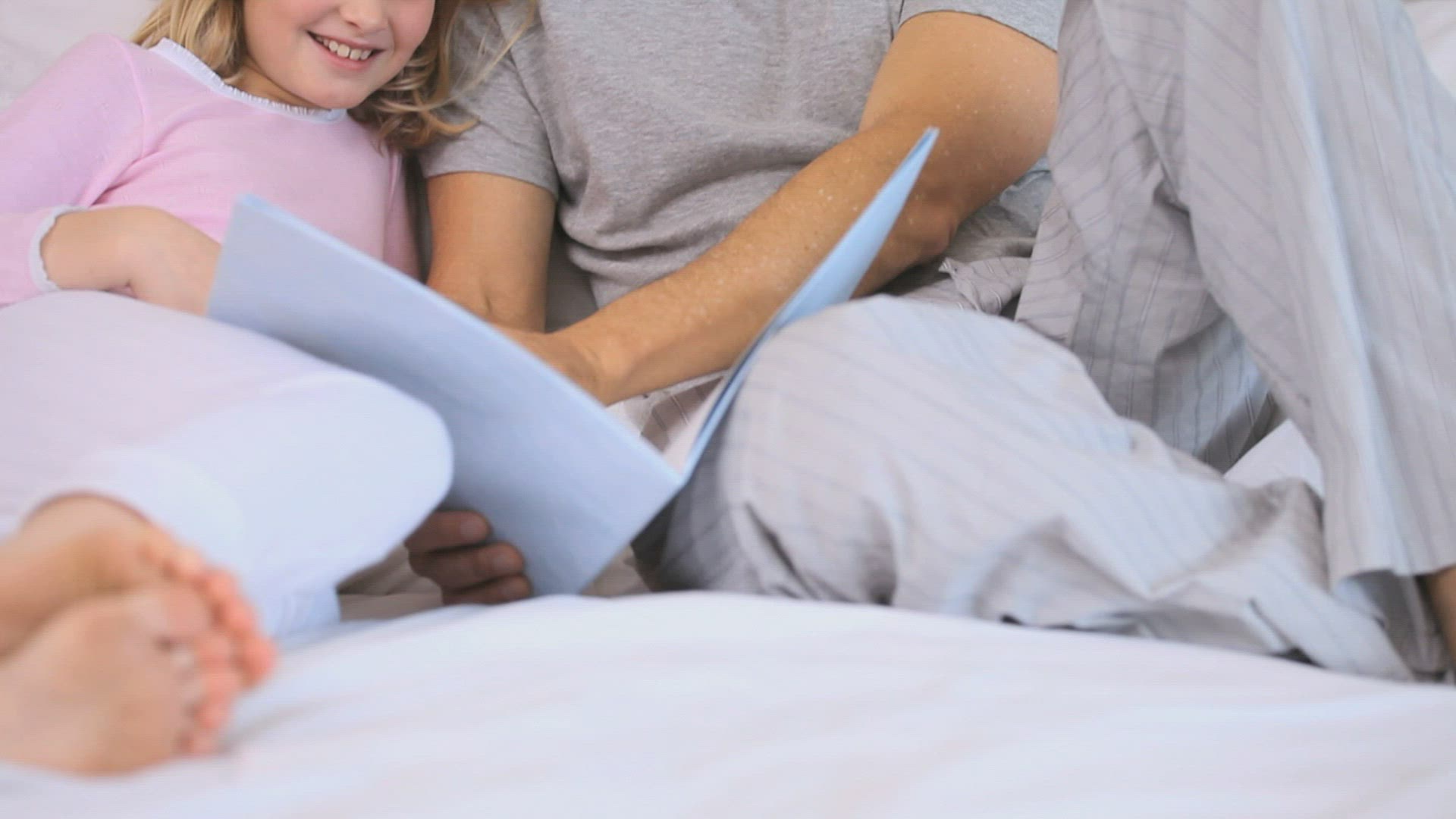 > Baby holding up book to read sitting on tiny sized chair in pajamas. DENVER, COLORADO