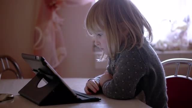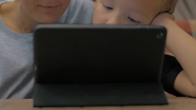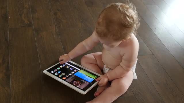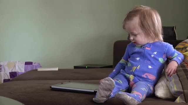 > Laughing baby playing with tablet computer on brown couch. DENVER, COLORADO