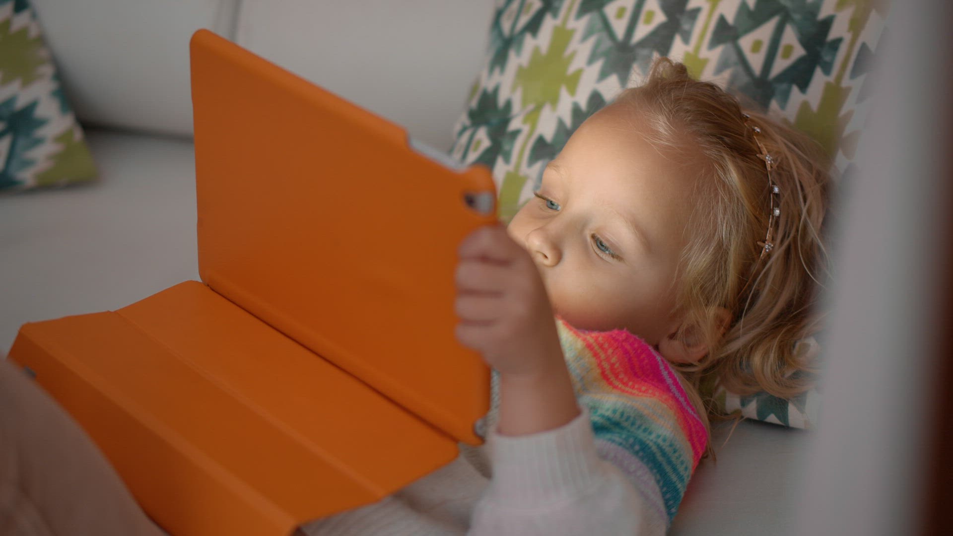 Laughing baby playing with tablet computer on brown couch. DENVER, COLORADO