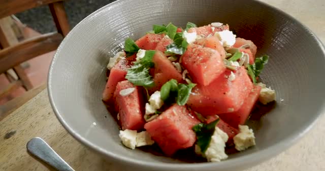 929735 - Close up of a healthy watermelon salad with mint and feta cheese in a bowl
