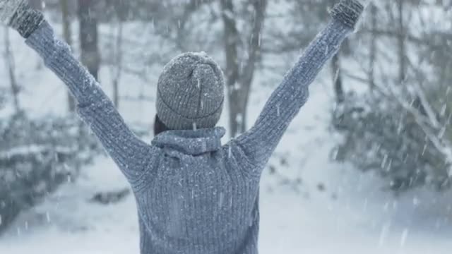 498327 - Attractive girl smiling behind sweater at camera in snowstorm