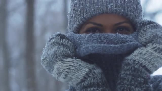 > Beautiful girl smiling behind sweater at camera in snowstorm
