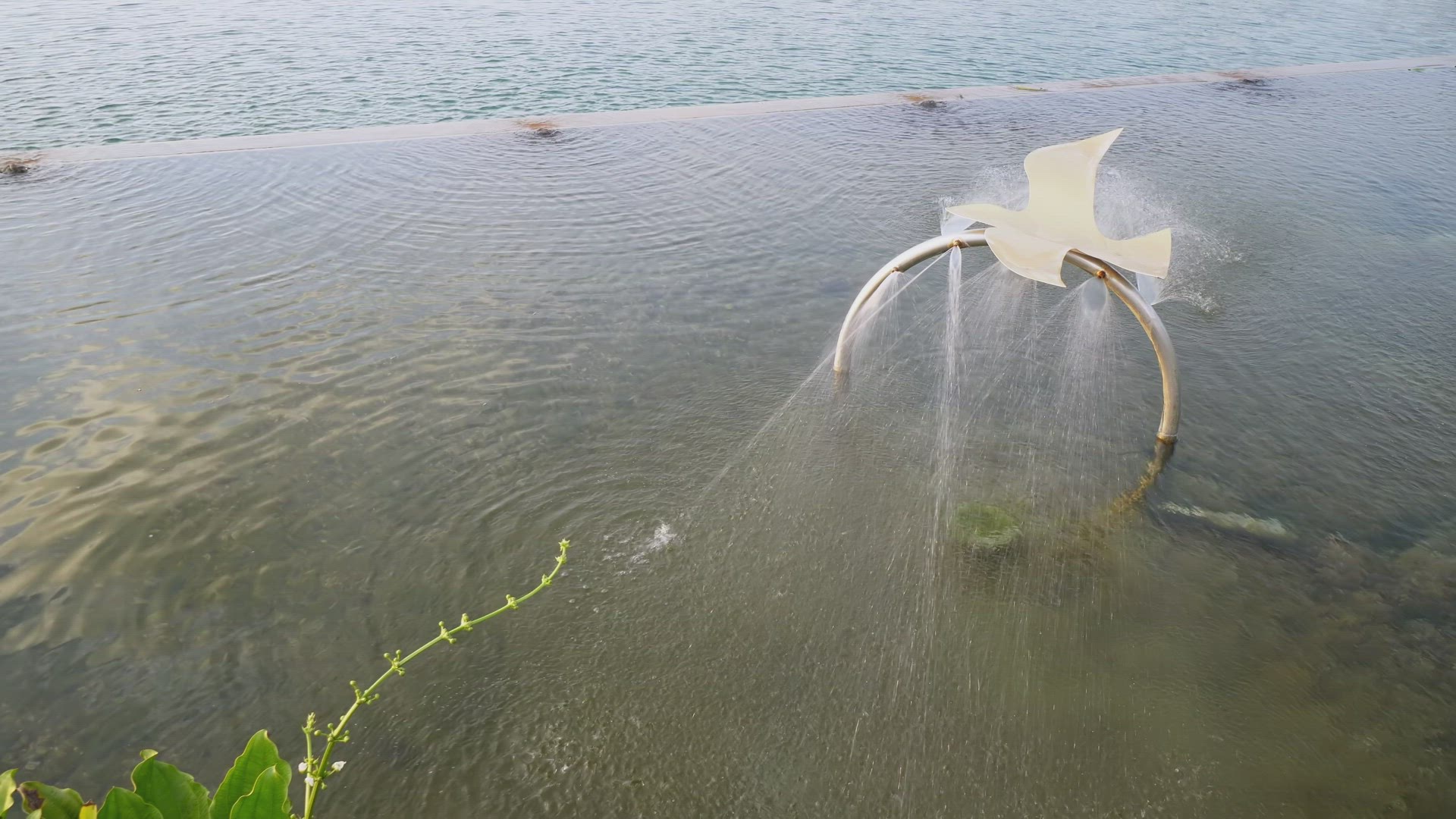 From the fountain which is located in the basin flows clean, blue water.