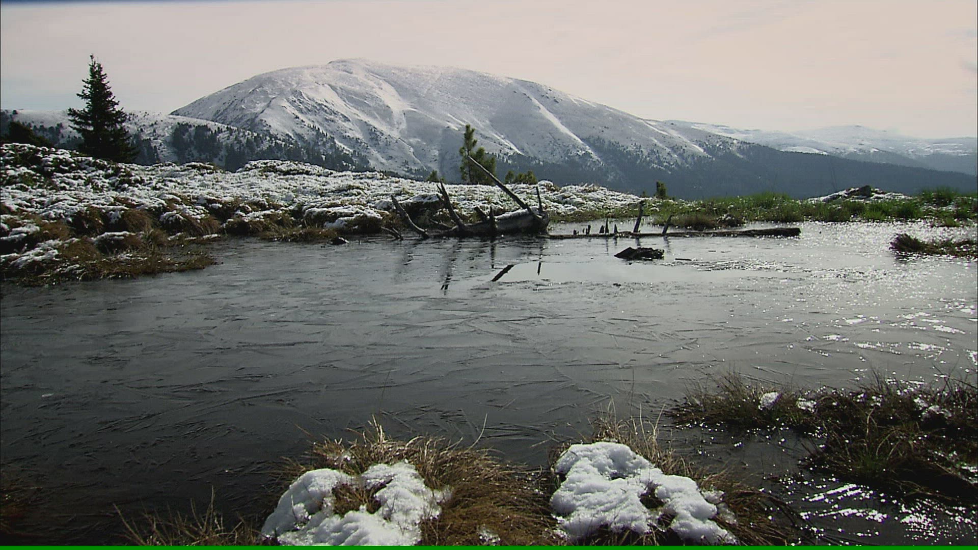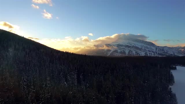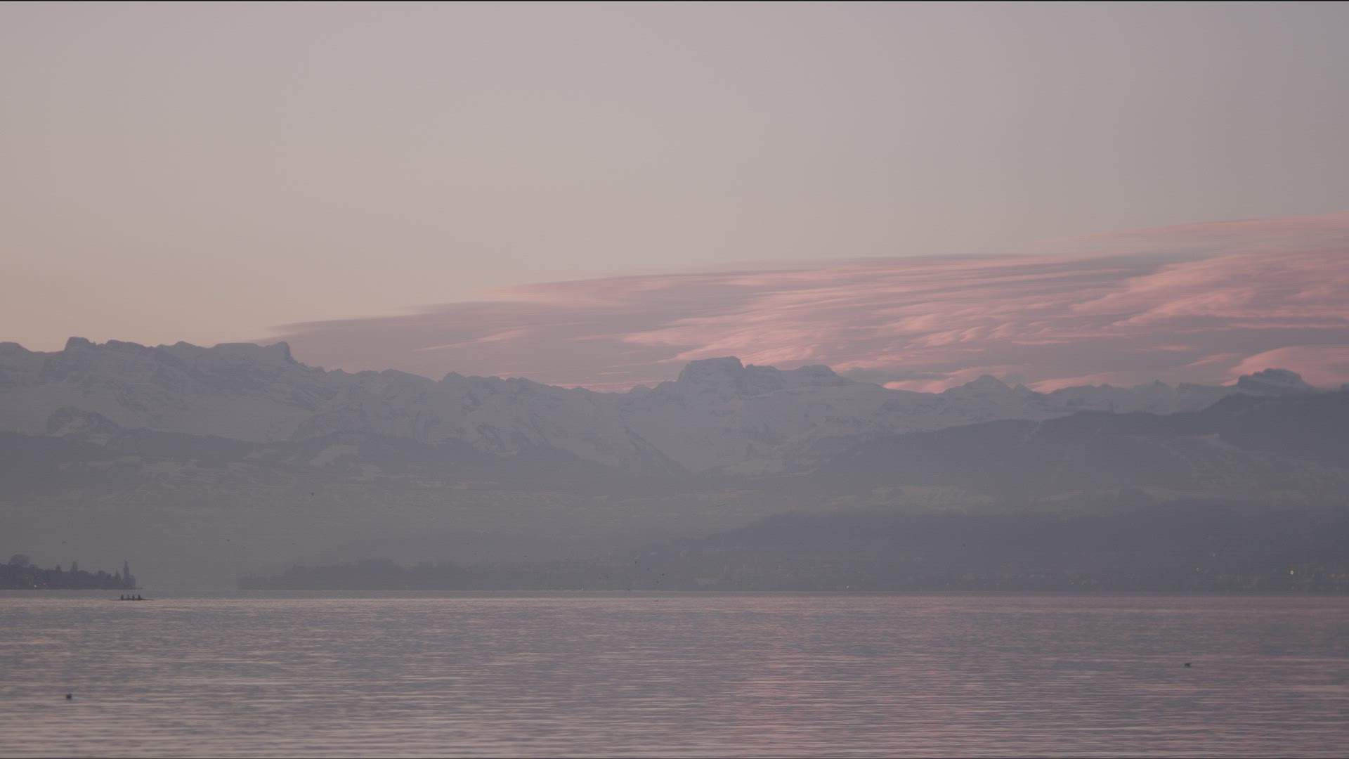 1095354 - Ice floating in lake looking towards mountain during sunset
