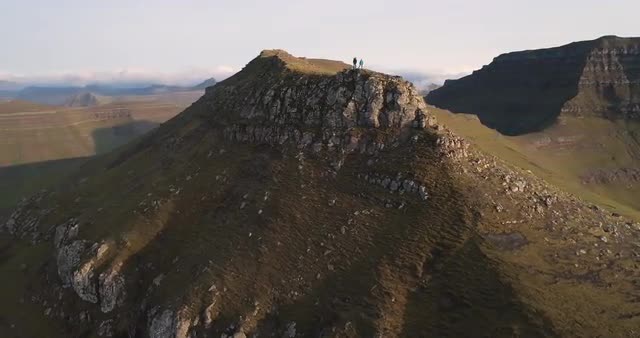 > Aerial shot of helicopter taking off from mountain top