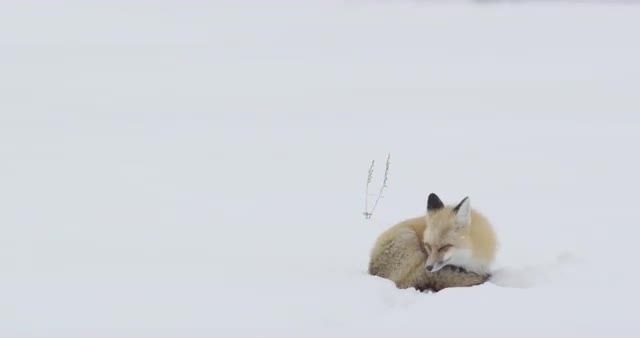 Red fox stretching and laying down in winter.