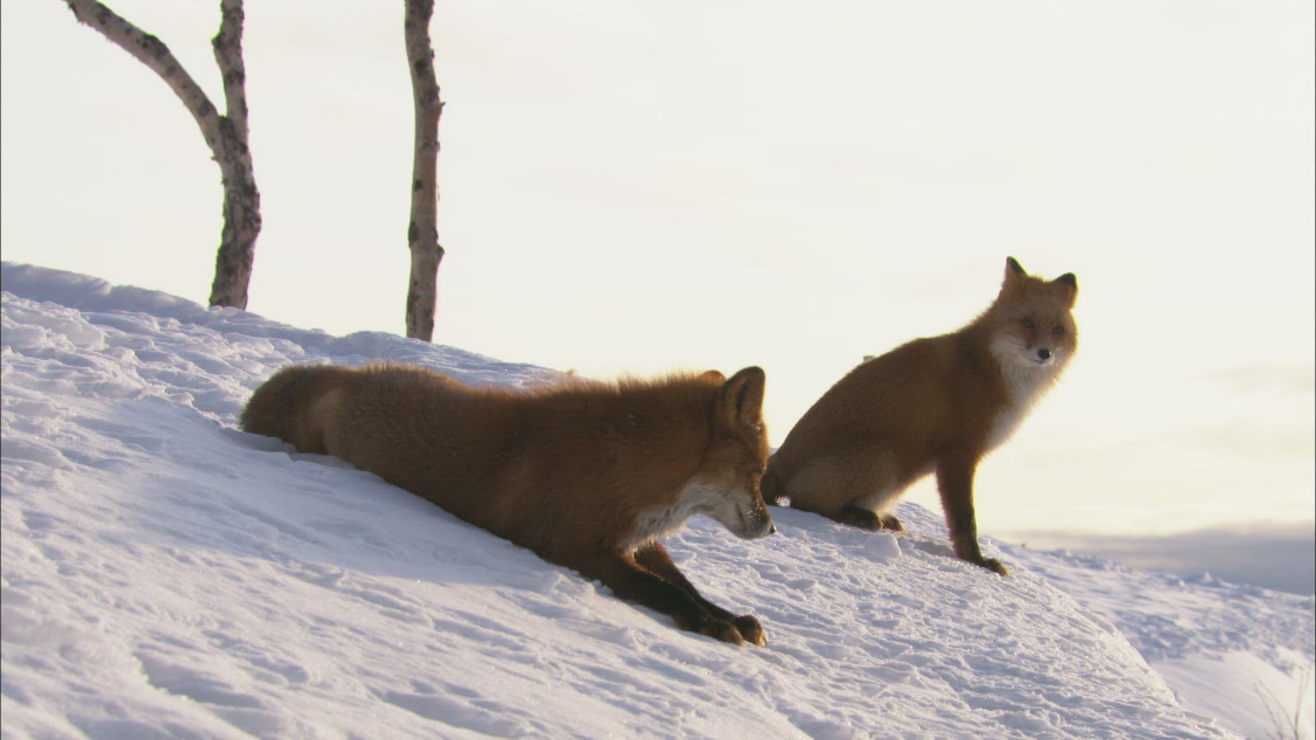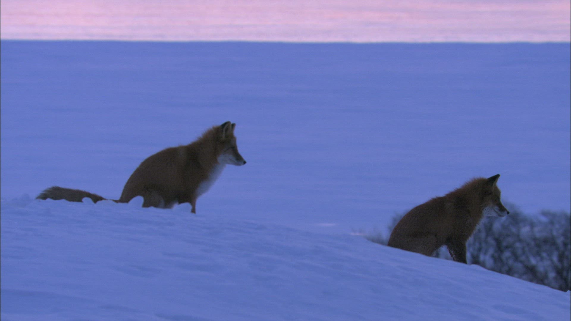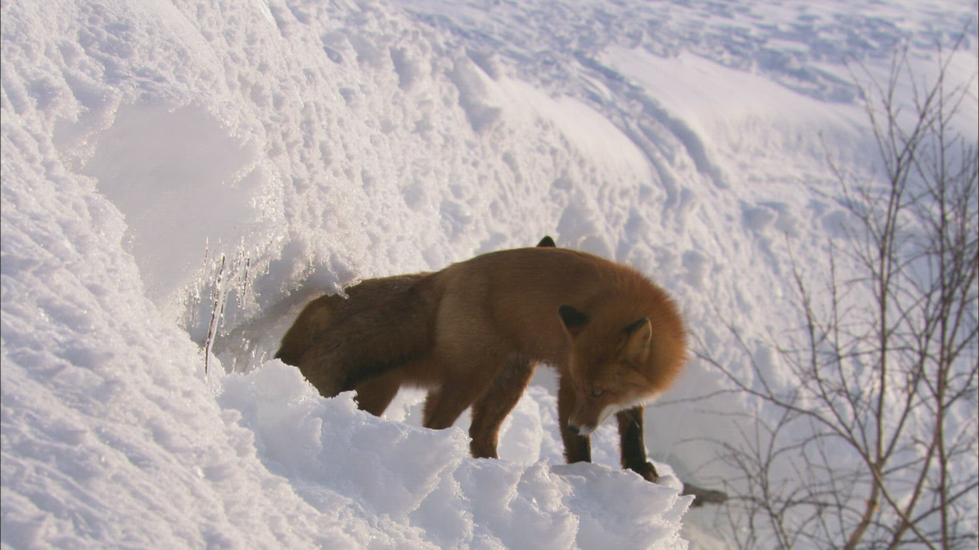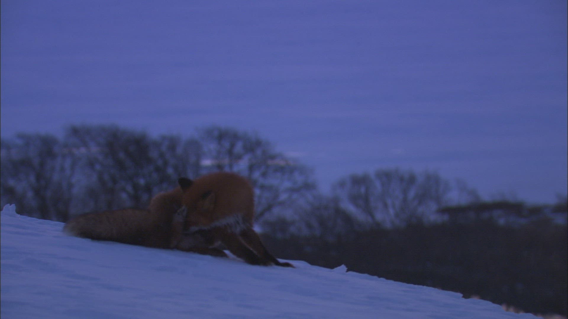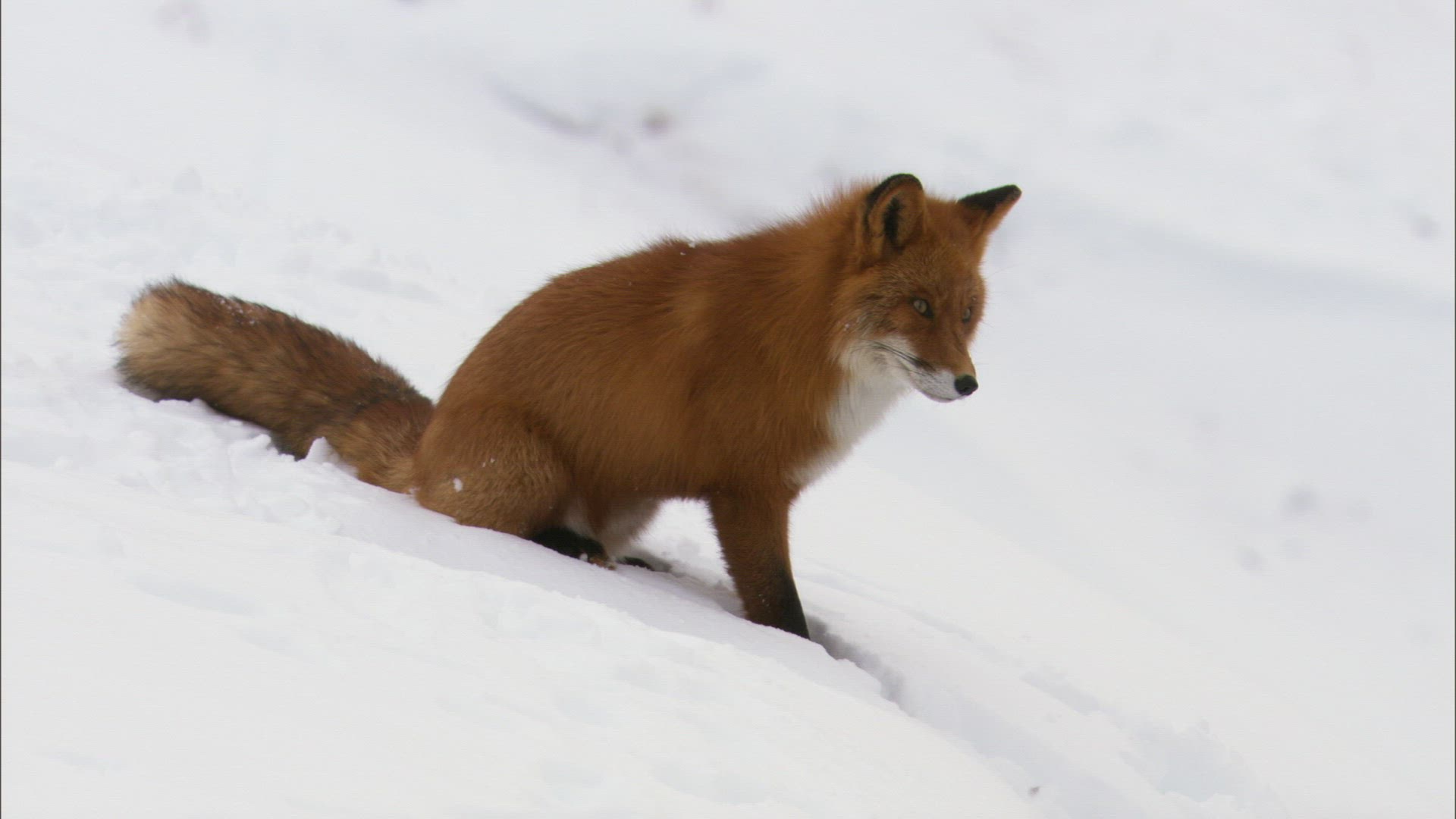 > Red Fox Sitting while it snows in Grand Teton National Park