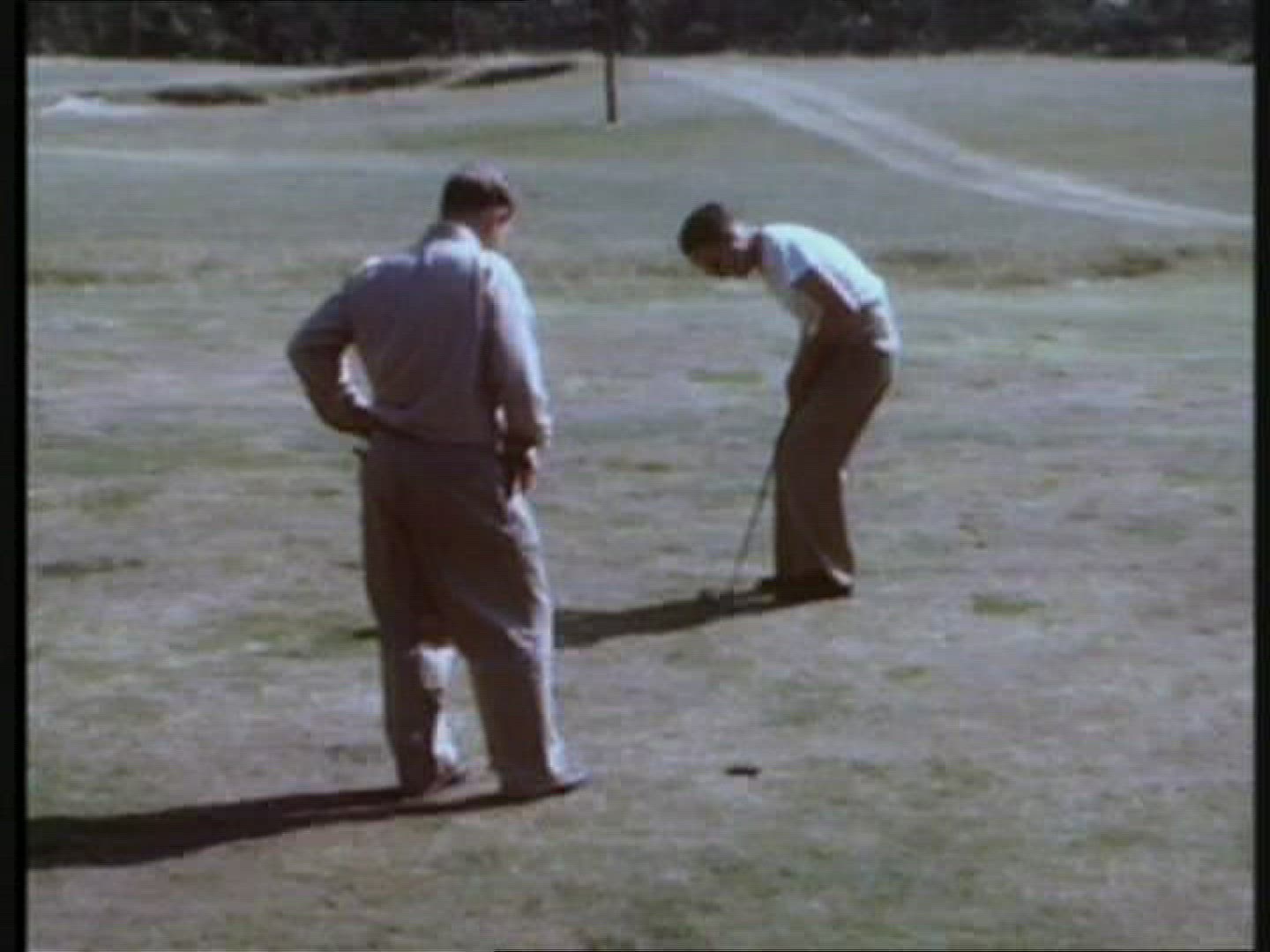 > 1945: Woman missing golf ball practice swinging with gray shorts. TRYON, NC