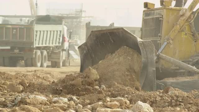 Man, Worker in Yellow Workwear and Blue Safety Earphones Have Left the Running Machine, rotating grinder, got back, man is Grinding the Blocks, Stones, Pieces of Concrete, Grinding by Grinder, Grinding Machine Close Up , Flying Dust, Road Repair, Cars ,Cityscape, City Street, Outdoors