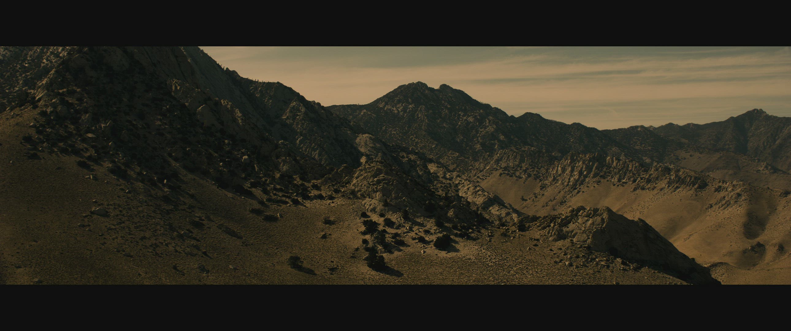 This is an aerial view of a truck driving on a dirt road, with mountain ranges and trees are in the distance.