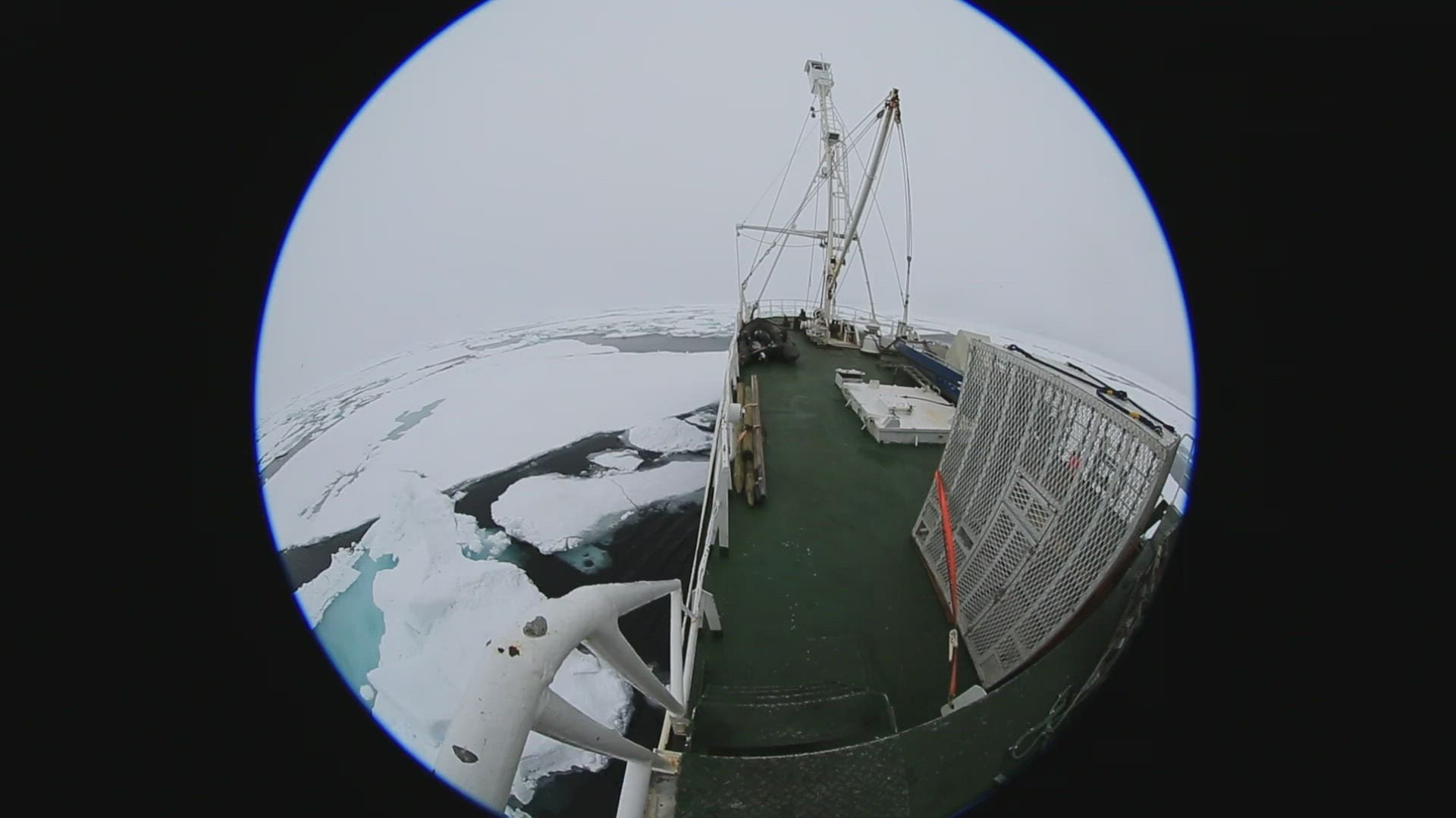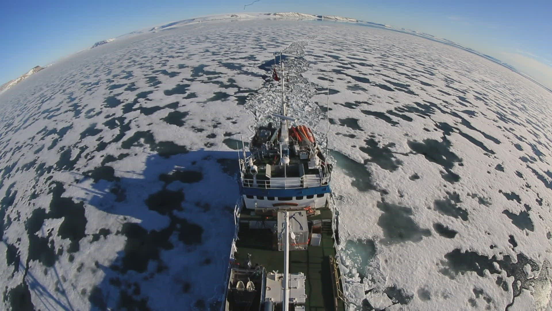 This is an extreme wide, driving shot of some barns in a farm field. A mountain range is seen in the distance, with storm clouds at the top of the frame.