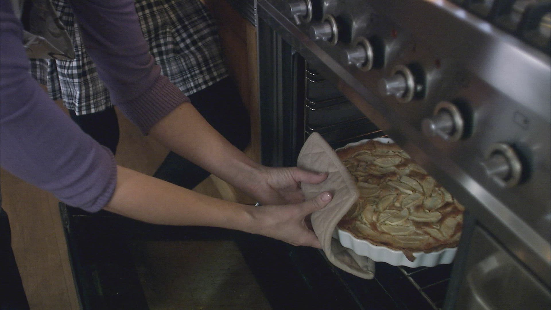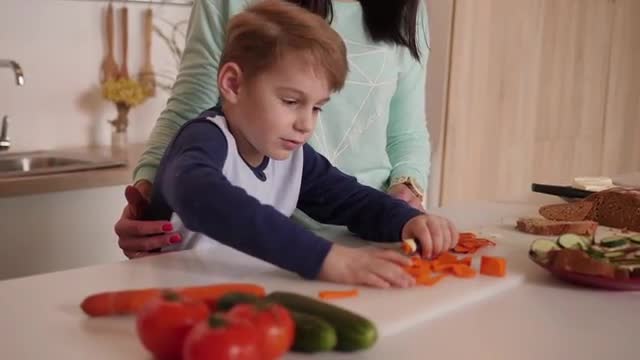 The family is preparing a cake with apples. Hands of mother and children prepare a cake. Hands of mother and children put the apples on the dough. Pie of thin dough. Big porezanye apples lie on a plate. dough. tray in the shape of an apple. light from the window. children next to the table with the cake.